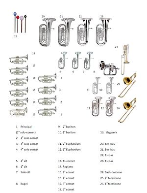 | ブラスバンドの編成(Wikipedia 「英国式ブラスバンド」より) | |||||